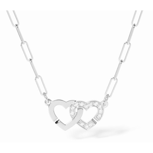 Náhrdelník Double Cœurs XS v bielom zlate s diamantmi. Dva prepletené srdcia spájajú modernú fúziu s nadčasovým symbolom spojenia. Jemná retiazka nesie ikonický motív Maison, ktorý vyjadruje lásku, priateľstvo a puto.