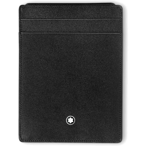 Unisex puzdro na karty z kolekcie Meisterstück je vyrobené z čiernej, plnozrnnej hovädzej kože s exkluzívnym Montblanc leskom. Koža je chrómovej úpravy, celopriečne farbená, doplnená čiernou žakárovou podšívkou s logom Montblanc. Malé, no mimoriadne funkčné – ponúka štyri sloty na kreditné karty, tri ďalšie priehradky a odnímateľné priehľadné puzdro na doklady.