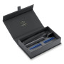 Darčeková kazeta s guľôčkovým perom Parker IM Monochrome Blue s mosadzným telom pokrytým matným temne modrým lakom. V kombinácii s doplnkami potiahnutými pomocou techniky PVD odolnou lesklou temne modrou farbou.