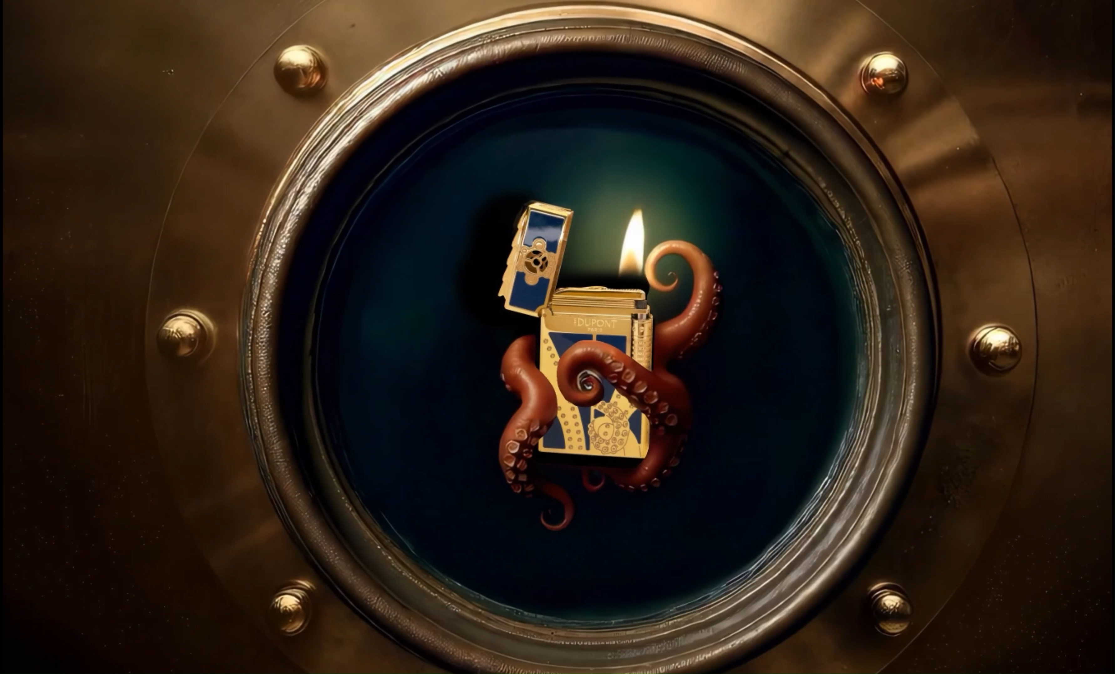 Nočná modrá farba zapaľovača Le Grand Dupont: Lesklý modrý lakovaný zapaľovač Le Grand Dupont s chápadlami v tvare chobotnice vygravírovanými v lakovanom zlatom prevedení. Zlatá povrchová úprava. Dekorácia Mobilis v mobile. Perforovaná čiapka preberajúca dekoráciu Hublot z Nautilus a zdobená ornamentami. Vybavené dvojitým zapaľovacím systémom pre žltý alebo modrý turbo plameň.