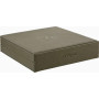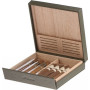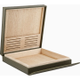 Exteriér z khaki zrnitej kože, interiér z masívneho dreva Okoumé. Magnetický systém otvárania zhora nadol. Kapacita na osem cigár.