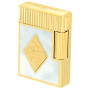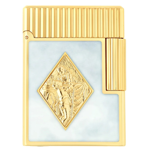 Zapaľovač Line 1 Cling s bielym lakovaným leskom, zdobený zlatým medailónom s motívom Romea a Júliety. Vertikálny gilošovaný klobúčik. Žltozlatá povrchová úprava.
